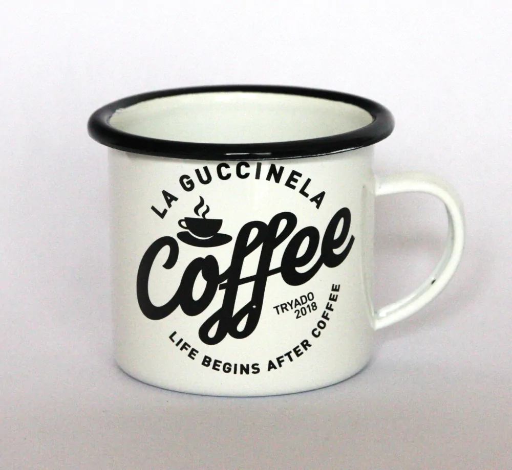 Plecháček v bílé barvě s potiskem - plechový hrníček je skvělý a originální dárek pro ženy a muže, všechny, kdo si rádi vychutnávají kávu.