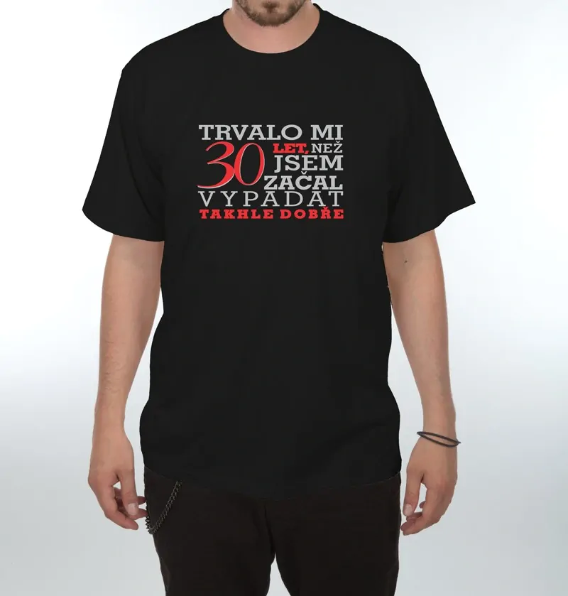 Třicátiny se slaví jen jednou – a tohle tričko je přesně ten dárek, který zůstane nezapomenutelný! 🎉 Vtipné tričko „Trvalo mi 30 let, než jsem začal vypadat takhle dobře“ potěší každého muže, který slaví kulaté narozeniny a má smysl pro humor.