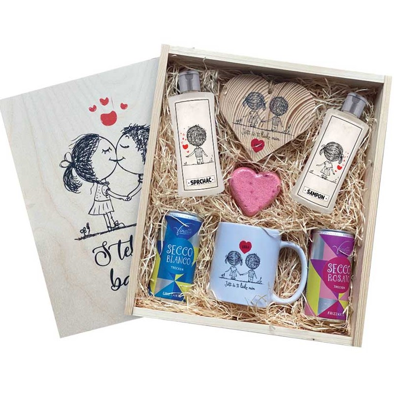 Tento set je navržen tak, aby kombinoval radost, romantiku i relax – a to vše v elegantní dřevěné krabičce s potiskem.