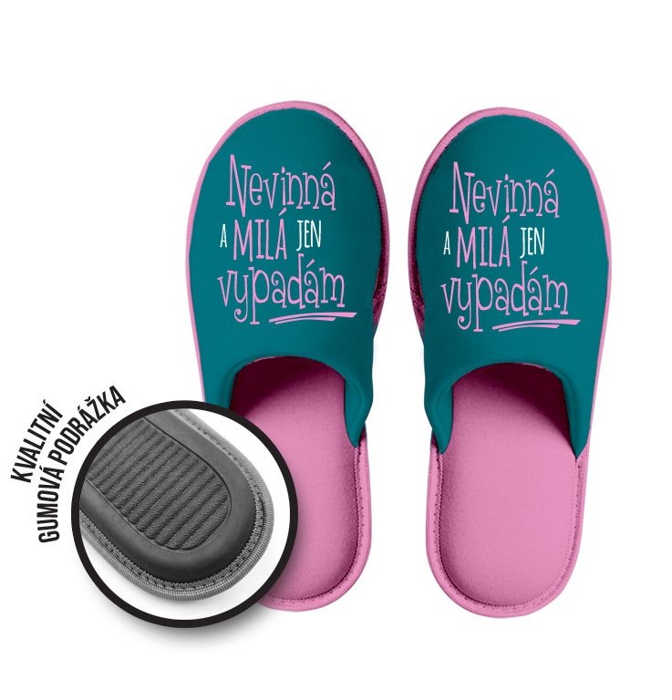 Dárkové bačkory „Nevinná a milá“ – pohodlí s humorem 🥿