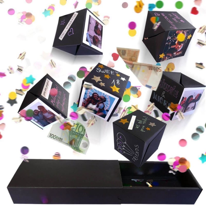 Princip je jednoduchý, ale efekt dokonalý. Jakmile obdarovaný otevře velkou balicí krabičku, rozletí se flitry a vyskočí celkem 6 papírových krychlí, které můžete libovolně dozdobit, popsat, polepit fotografiemi nebo do nich schovat malé dárky.