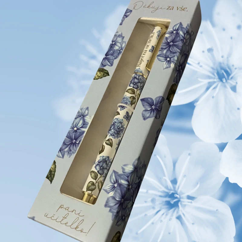 Hledáte dokonalý dárek pro paní učitelku? Toto kovové kuličkové pero s motivem hortenzie je trefa do černého! 💙