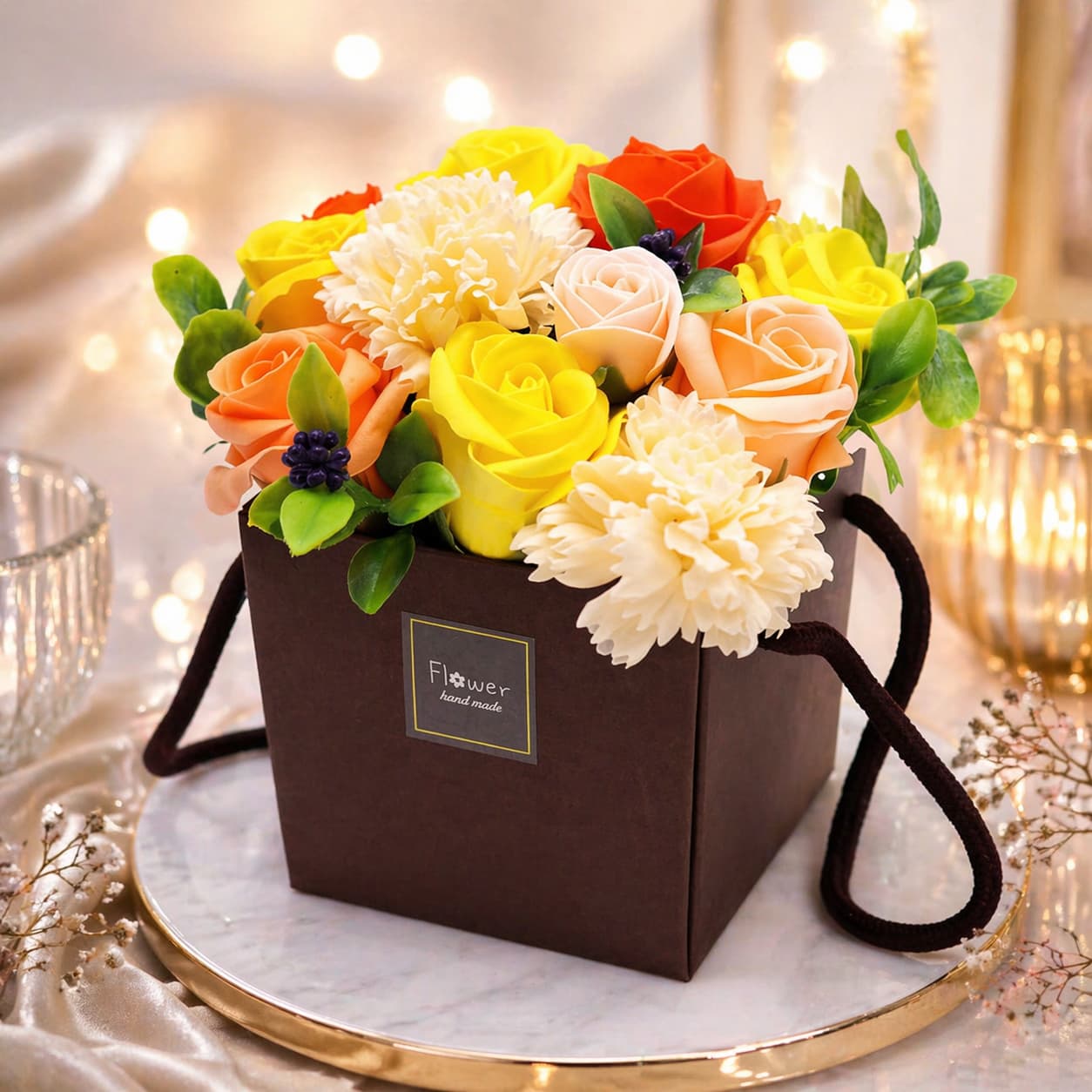 Mýdlová kytice Slunečné pohlazení je nádherný a originální dárek, který spojuje krásu květin s relaxačním zážitkem.